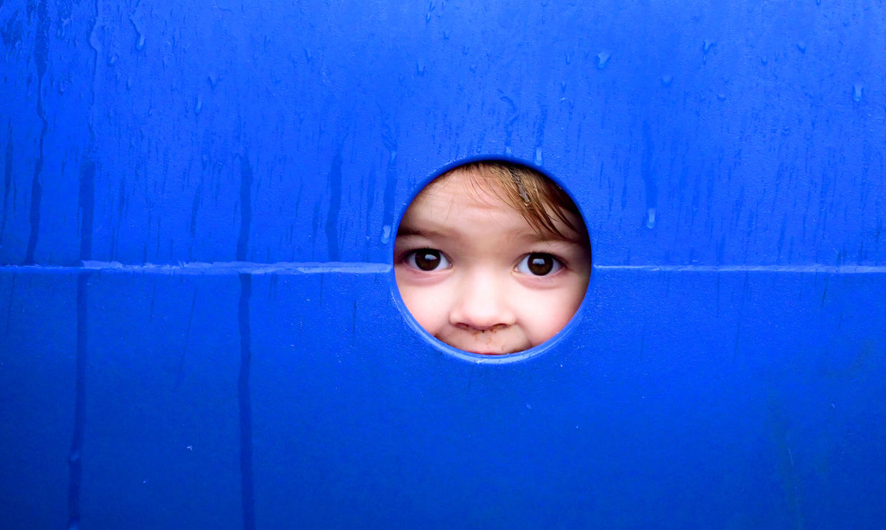 Annie Wright, 2, looks out from a playground tunnel as a light rain falls at Mary's Park in Pullman, Washington, on Thursday, February 1, 2024.