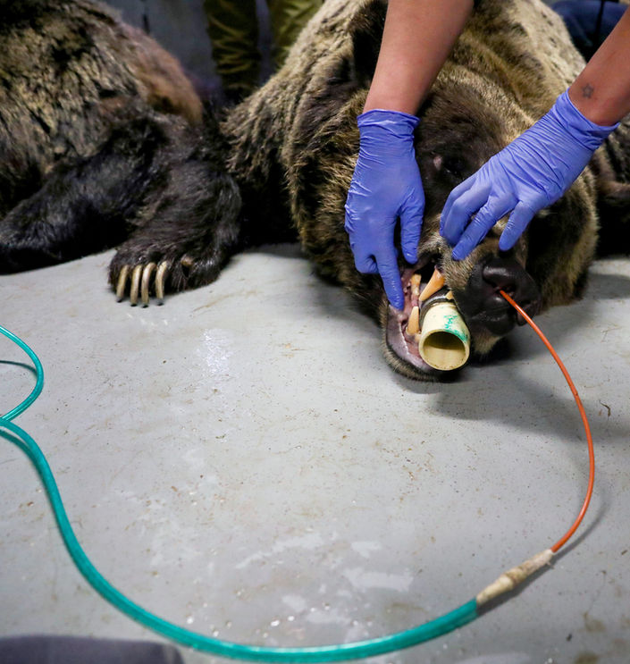 The gums of Adak, an 8-year-old and 460-pound grizzly bear, are checked for color to make sure he is handling sedation well during a procedure on Tuesday in Pullman.